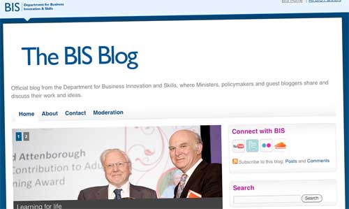 A fairly soft launch today for the Department for Business, Innovation and Skills’s new corporate blog: built by Steph Gray (obviously), using WordPress (naturally).