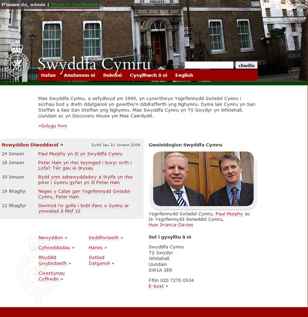 For the readers, there are immediate benefits. Obviously, it’s prettier. It’s been coded with better accessibility in mind. Every page is automatically printer-friendly, using CSS. The blogging mechanism gives reliable, automated archiving by category and month. Not to mention the various RSS feeds. And as you’re legally entitled to expect, there’s a fully-functional Welsh-language version too.